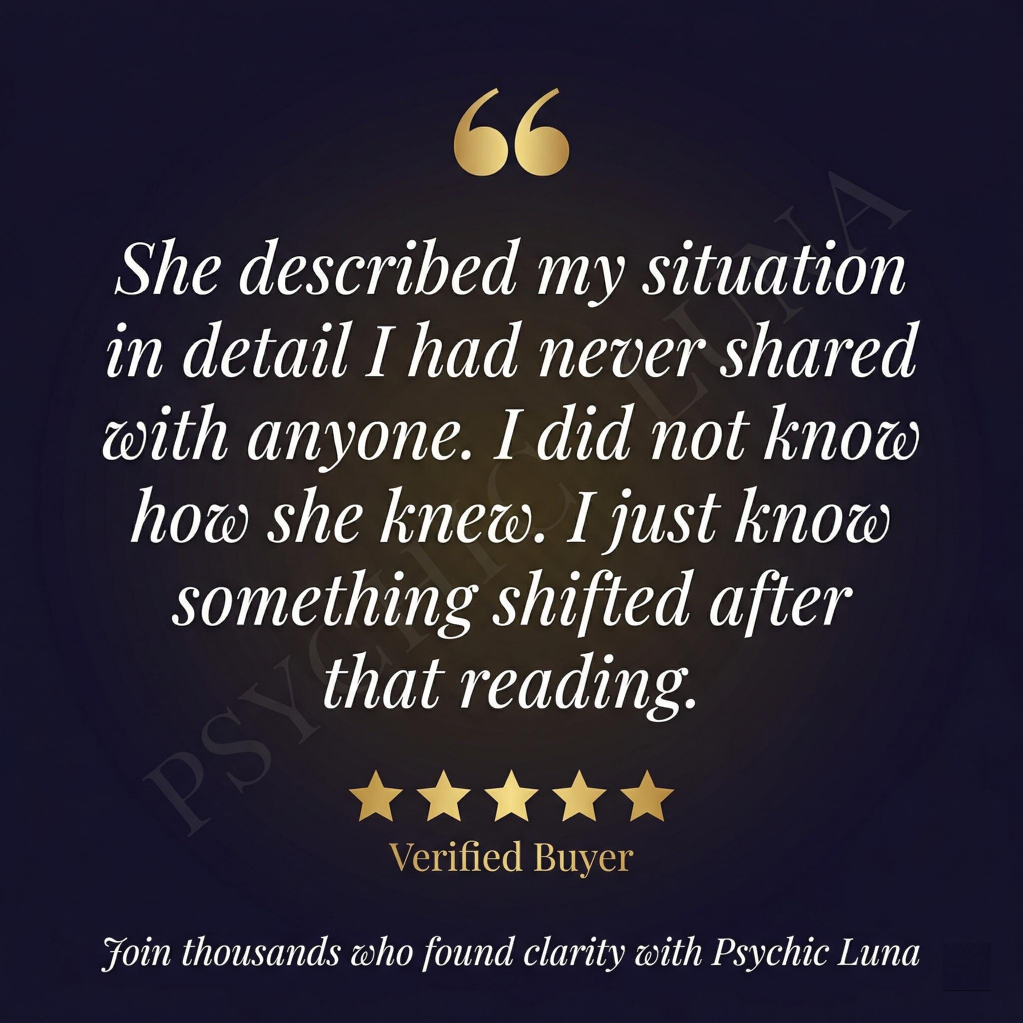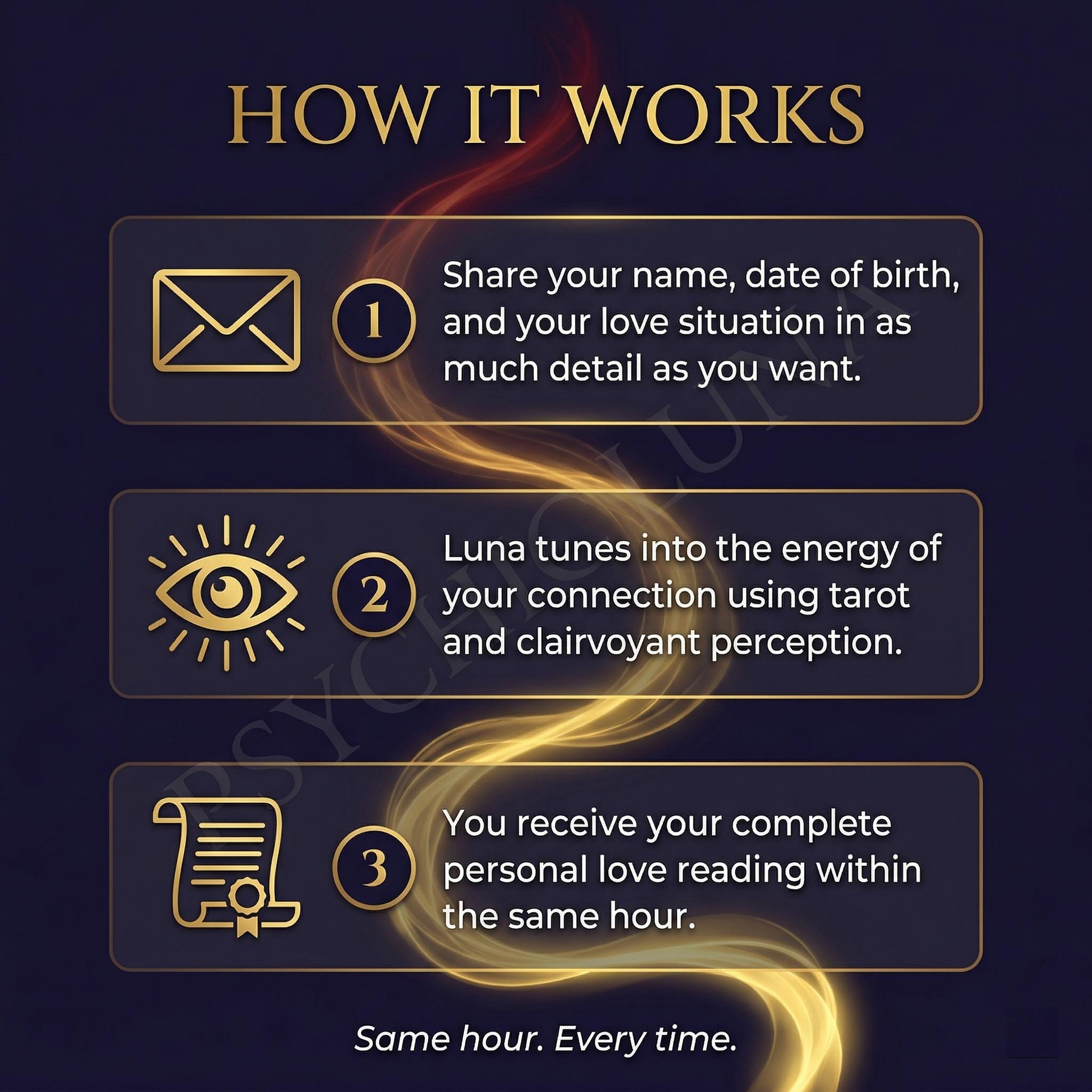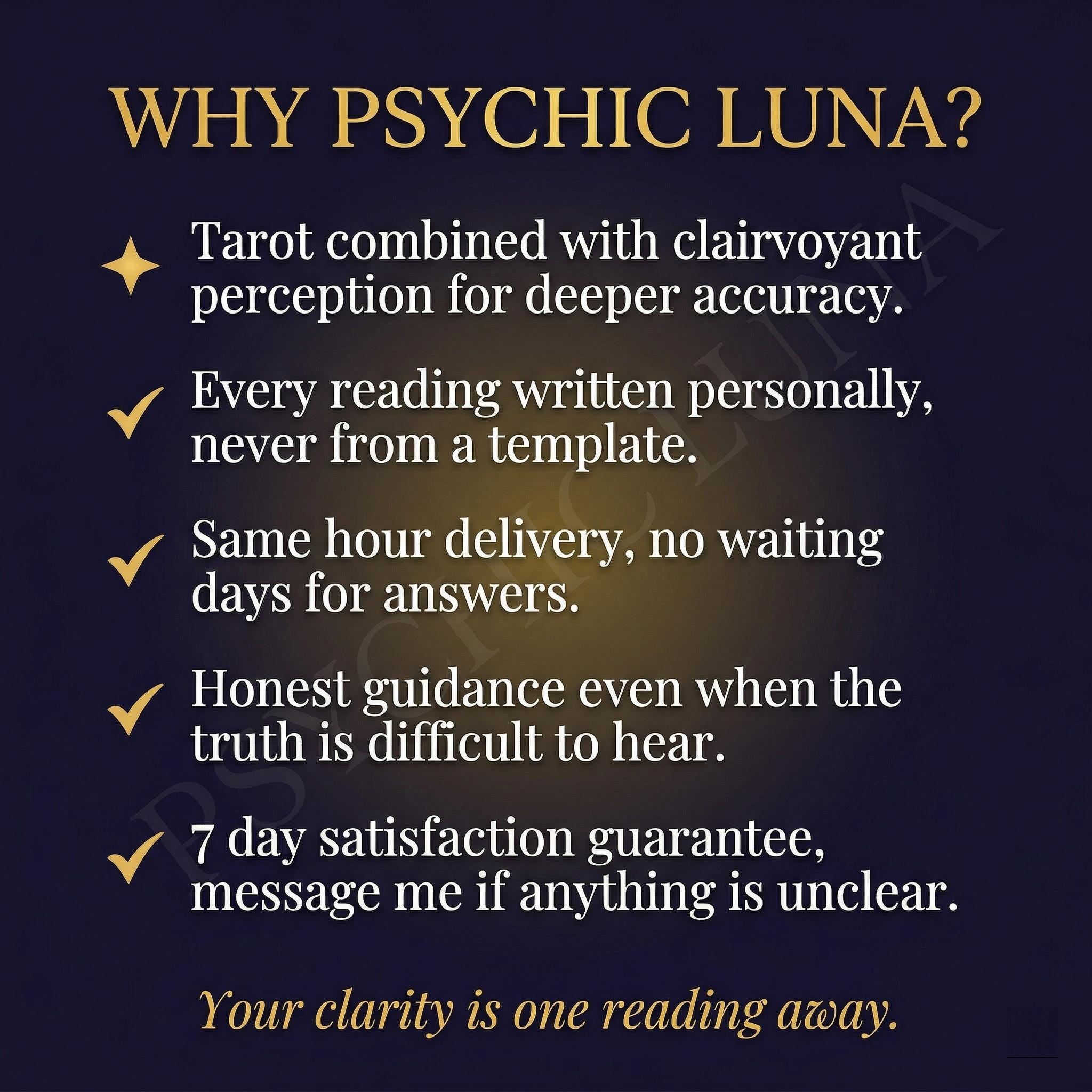 I am Luna. Every reading I deliver is personal and written specifically for your situation. No templates. No recycled guidance that could apply to anyone.