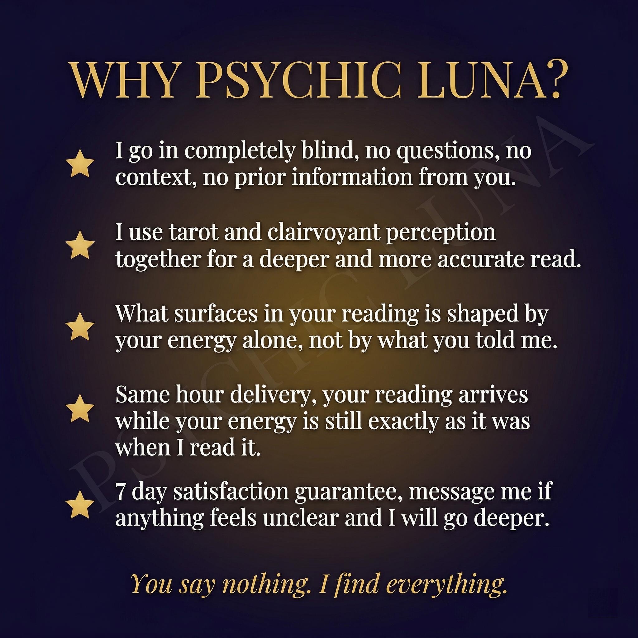 I am Luna. Every blind reading I deliver is personal and unscripted. If I find something difficult, I tell you. That is the point.
