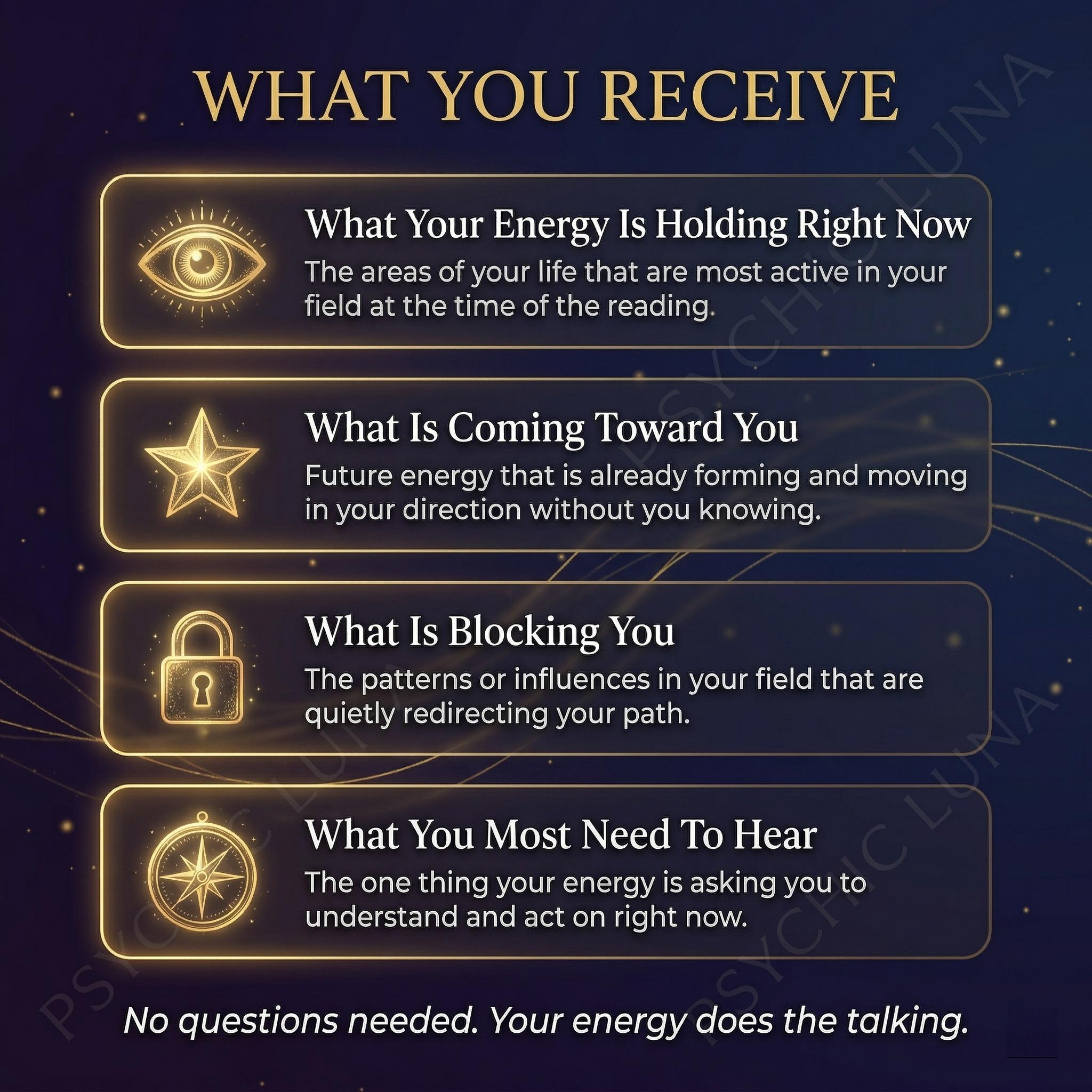 People come to this reading when they want to know what someone sees when they look at their energy with no filters and no guidance from them. Or when they are tired of asking the same questions and getting nowhere.