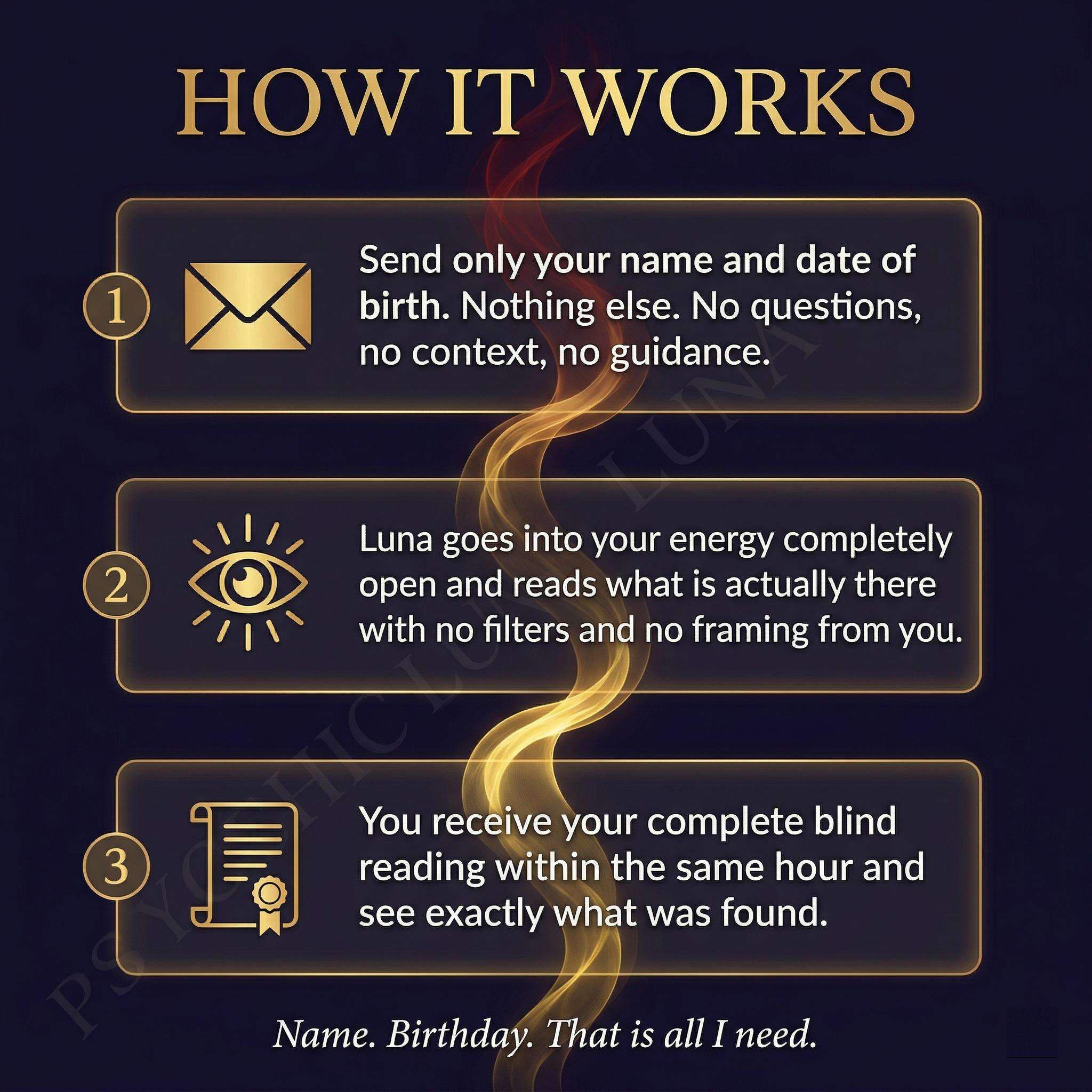You give me your name and your date of birth. Nothing else. No questions, no context, no direction. I go into your energy completely open and I tell you what I find. This is what separates a blind reading from everything else.