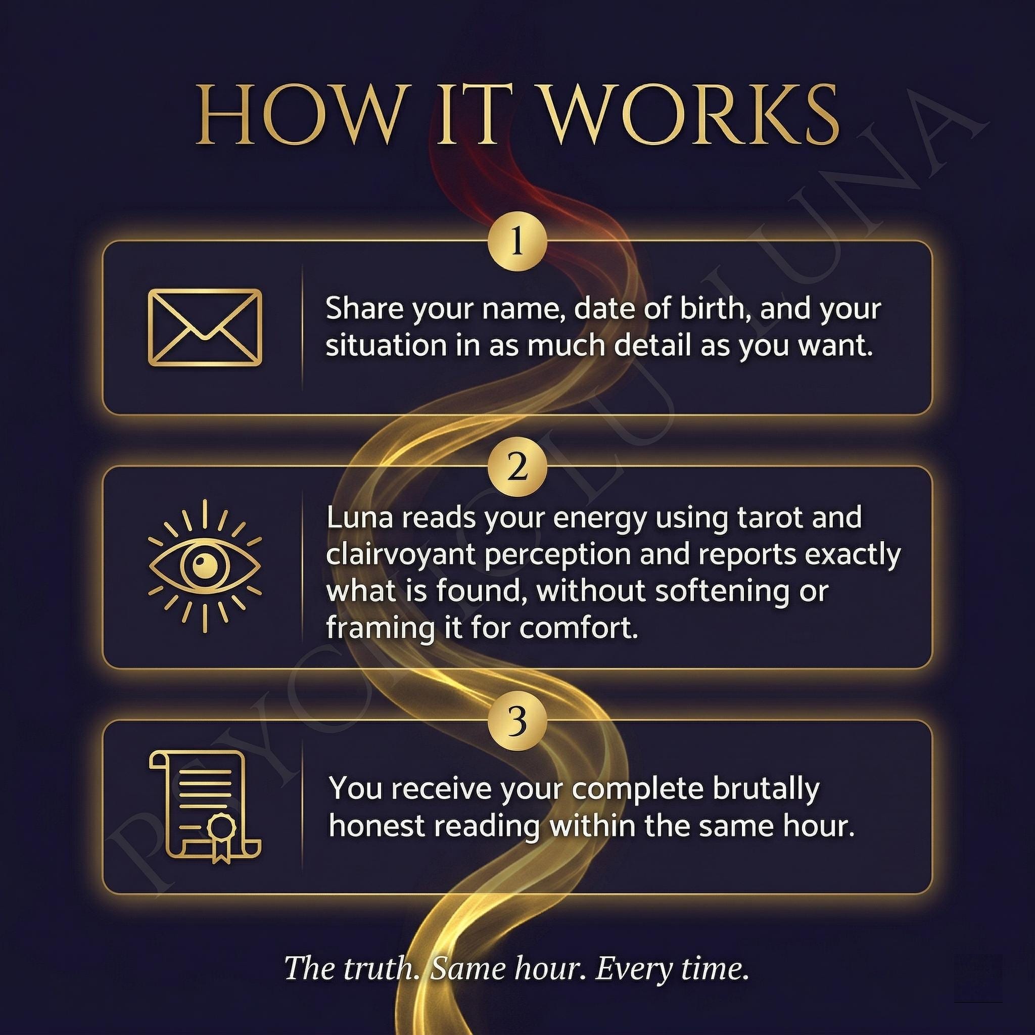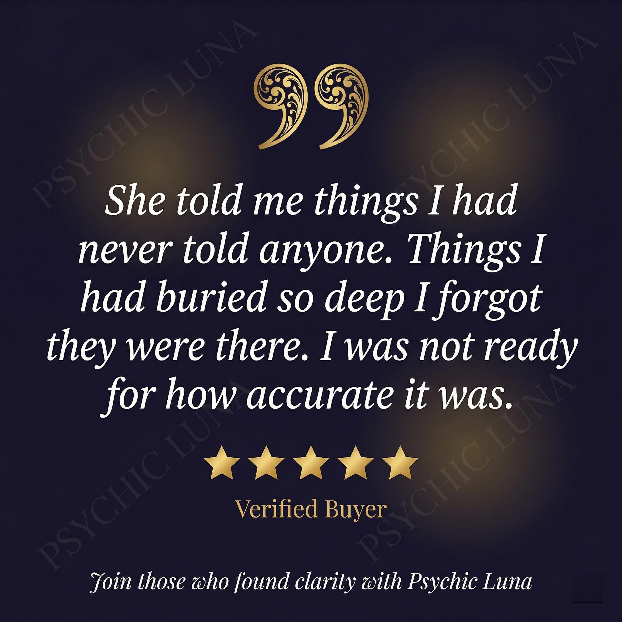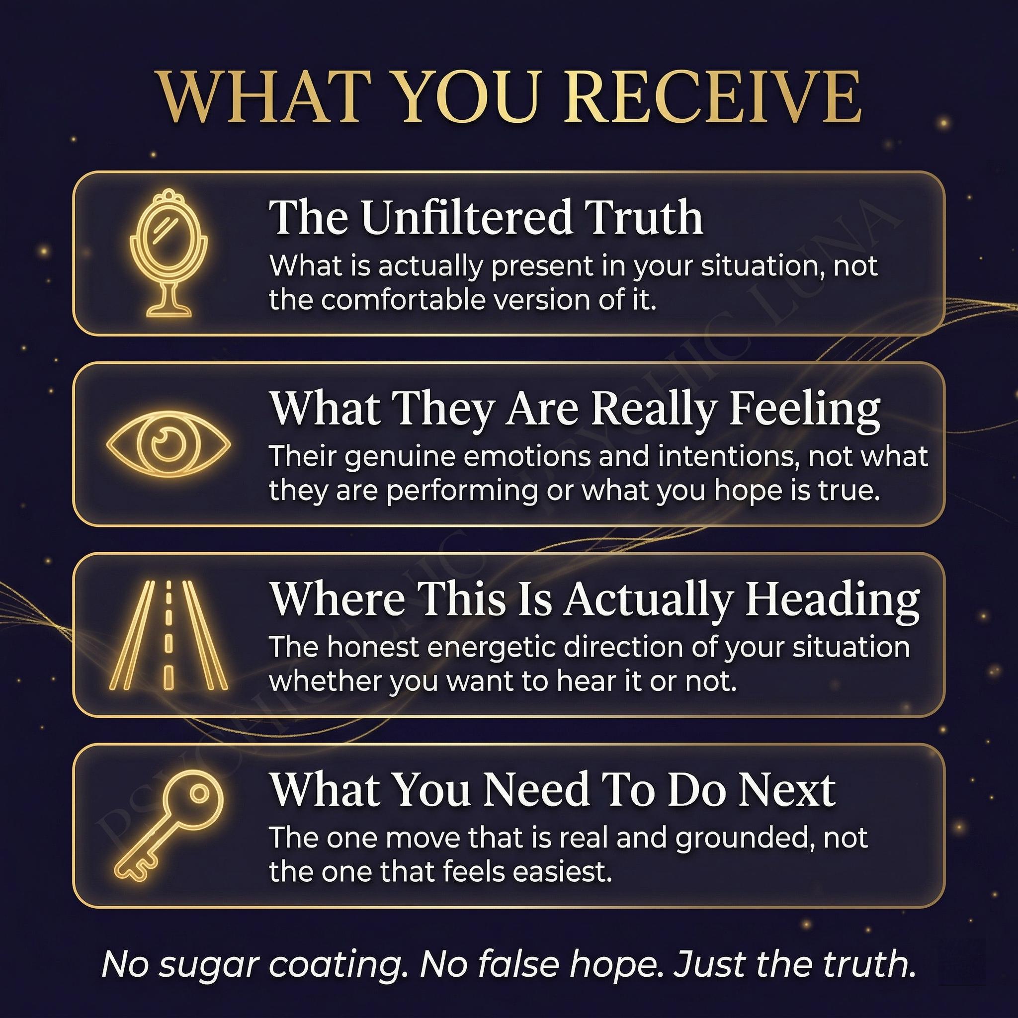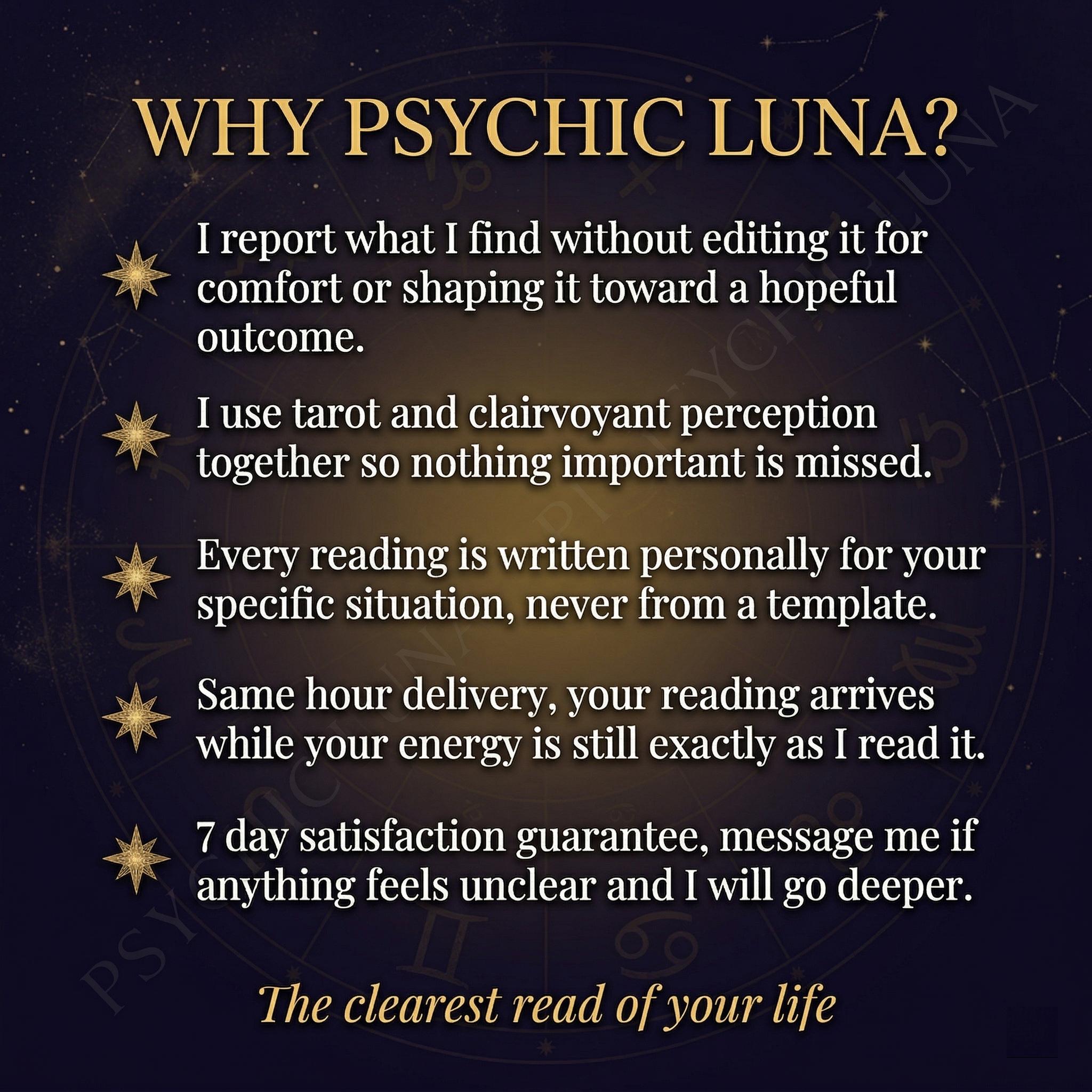 I am Luna. Every reading I deliver is personal, specific, and honest. If something difficult is present in your energy, I tell you. That is the point of this reading and it is the standard I hold every reading to.