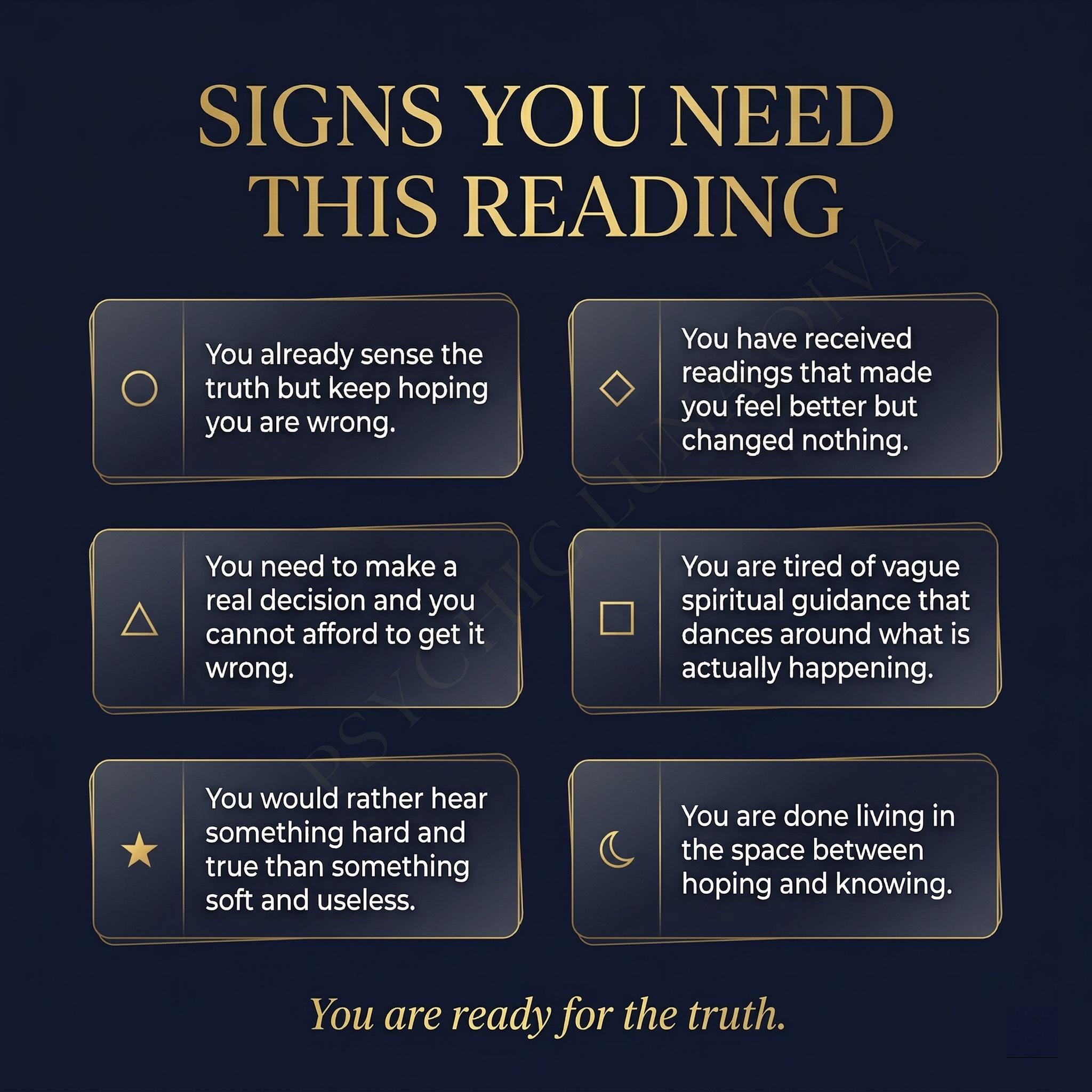 What makes this reading different is not what I look at but what I do with what I find. People who book this reading are done being told what they want to hear. They want to know what is real so they can make an actual decision and stop living in the space between hoping and knowing.