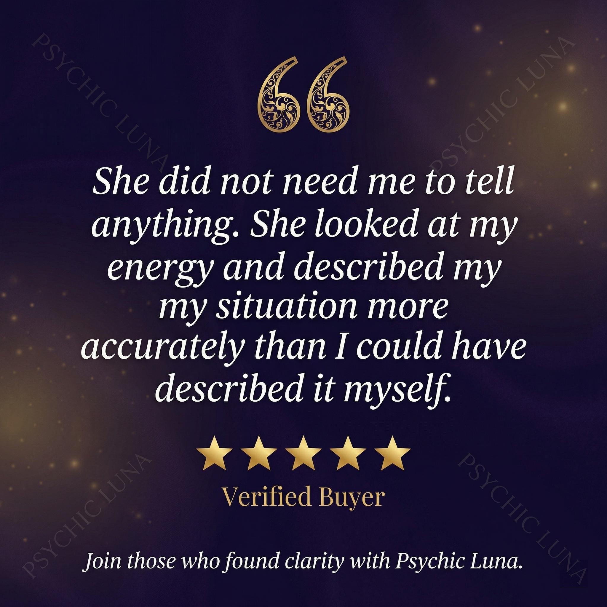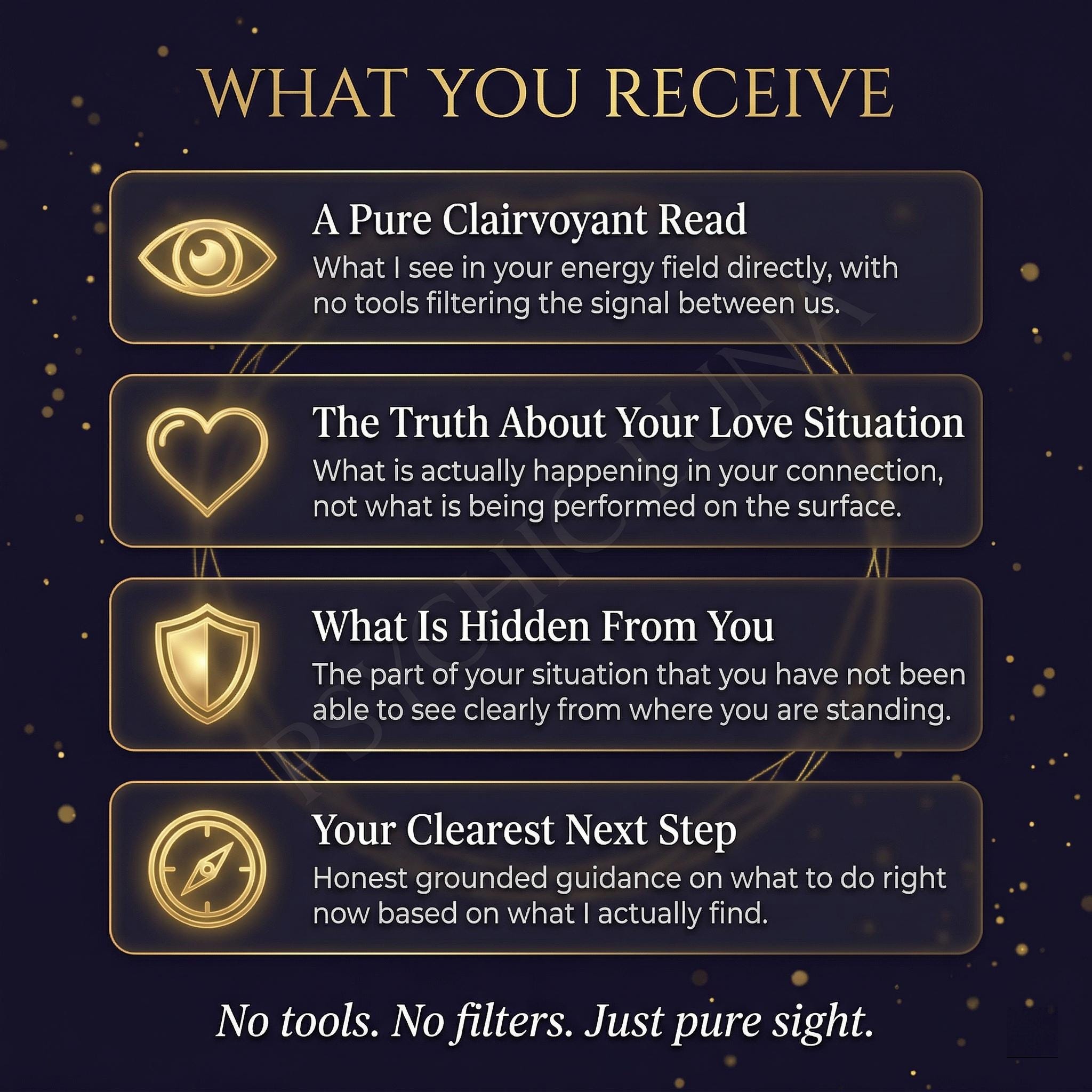 This reading does not need your input to work. I do not require a long explanation of your situation. No tools, no prior information. I tune into your energy directly using clairvoyant perception and I report what I find. What I deliver comes from what is actually present in your field, not from what you have described to me.