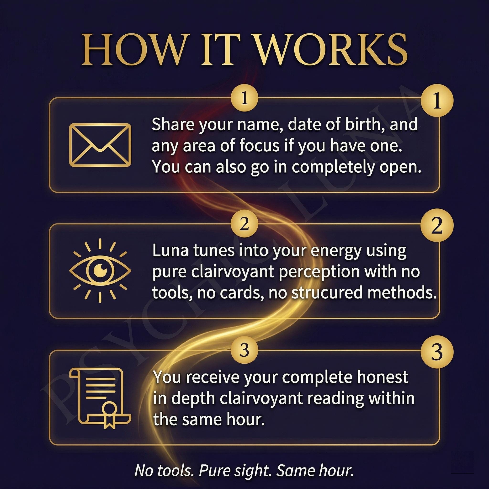 I am Luna. Every reading I deliver is written from what I genuinely find in your energy. If something difficult is present, I tell you. That is what honest guidance actually means.